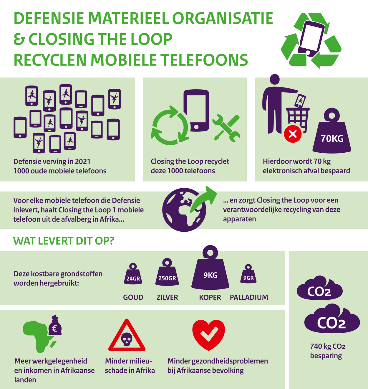 CtL zorgt ervoor dat de grondstoffen uit mobieltjes, zoals zware metalen en brandvertragers, niet in het milieu komen en kunnen worden hergebruikt. “Duurzaamheid moet eigenlijk niet worden gedreven door verplichting. Zoals Defensie het nu brengt, is het een positieve manier en dat spreekt de mensen meer aan, waardoor er meer medewerking is”, zegt Joost de Kluijver van CtL. “Van het materiaal uit de telefoons kunnen we weer nieuwe dingen maken. Het goud kun je bijvoorbeeld verwerken in sieraden. Ons uiteindelijke doel is om in de ontwikkelingslanden waar we de telefoons ophalen, een fabriek op te zetten waar ze de telefoons uit elkaar halen. Daarmee steun je ook nog eens de lokale economie.”