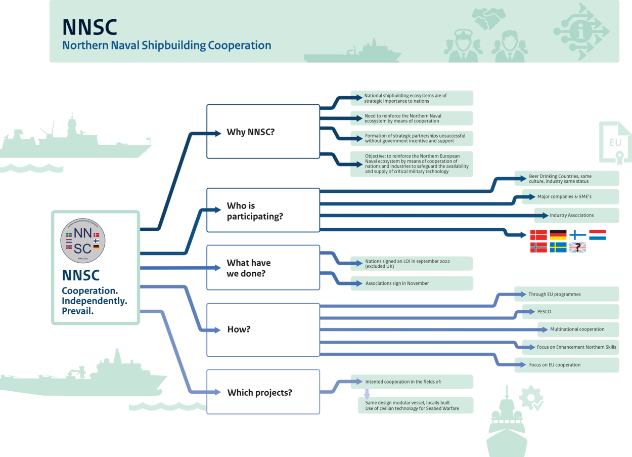 “Je moet dus ook zoeken naar synergie in onderwerpen”, benadrukt Flos. De intentieverklaring om als noordelijke Europese landen binnen de NNSC met elkaar verder te gaan ligt er nu. “We hebben afgesproken klein te beginnen met de landen die we nu hebben. We moeten aantonen dat het concept werkt door met concrete projecten te komen. Daarmee houd je vaart in het project. Quicks wins, om zowel de landen als de industrie te overtuigen dat dit de juiste weg is.” Het uiteindelijk doel? Dat er over tien jaar nogsteeds in al die landen een strategisch onafhankelijke marinebouw-industrie bestaat. En daar hebben de nationale marines en Europa als geheel een groot belang bij.