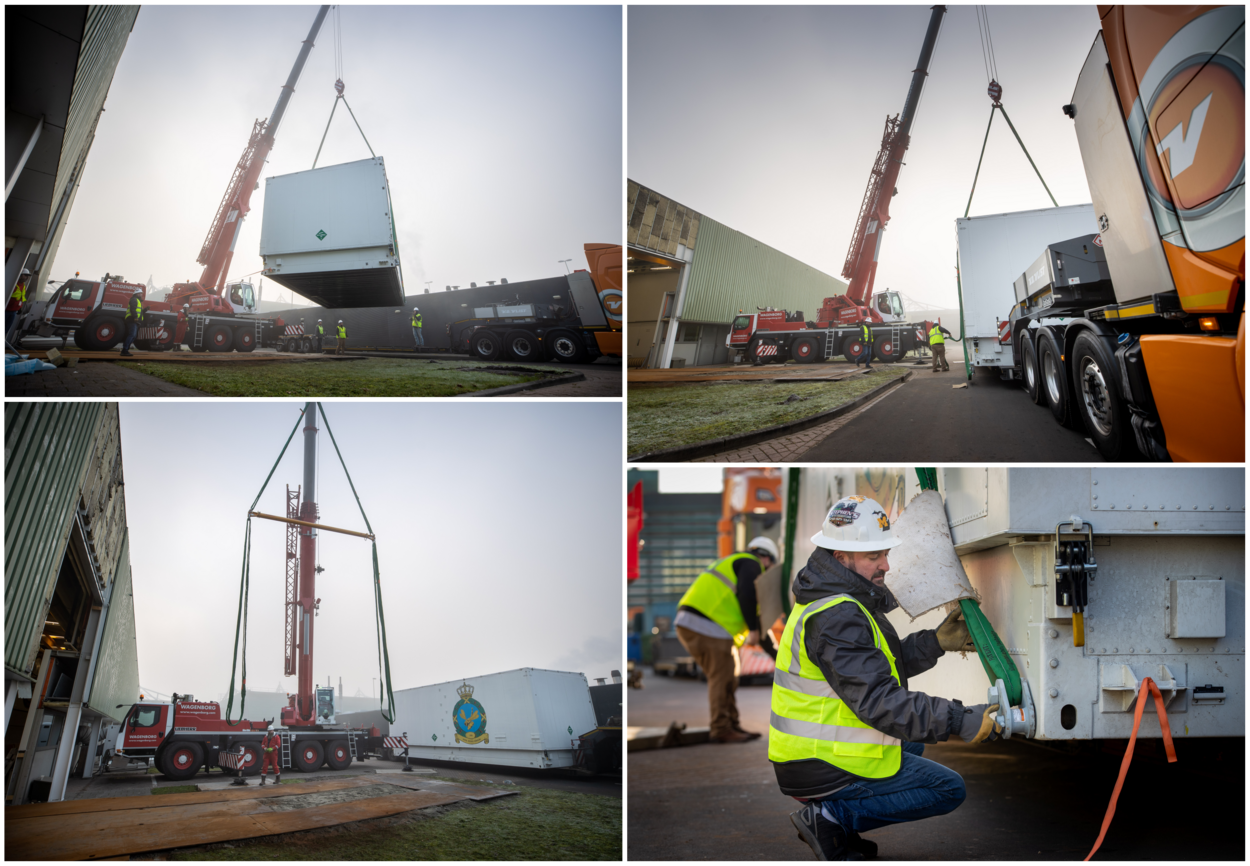 De containers van de TFPS zijn met een dieplader aangevoerd. Nauwkeurig worden de banden geplaatst en voorzichtig gaat het met de kraan naar de ingang.