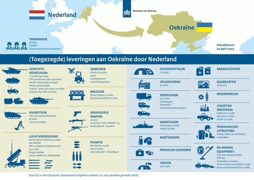 Defensie maakt voortaan meer informatie openbaar over de militaire leveringen aan Oekraïne. Dit schreef minister Kajsa Ollongren op 13 april in een brief aan de Tweede Kamer. Er is bekendgemaakt wat voor type goederen en middelen zijn gedoneerd sinds 24 februari 2022. Hierdoor wordt voor het eerst de breedte, diversiteit en omvang van de Nederlandse militaire steun inzichtelijk gemaakt. Nederland heeft inmiddels ter waarde van € 1,2 miljard aan militaire steun geleverd aan Oekraïne.