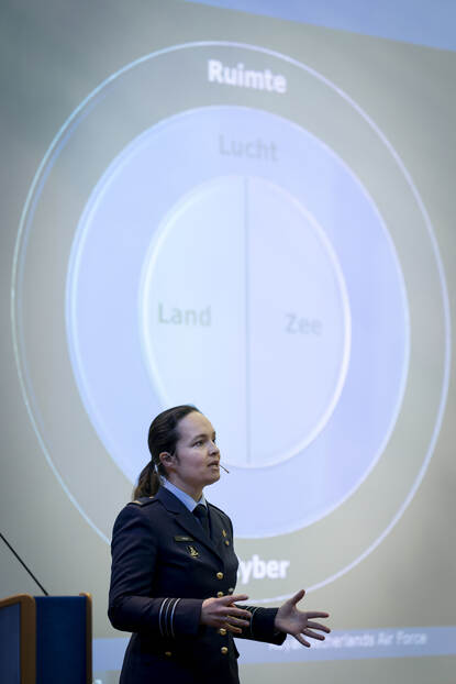 “Vrijwel alle wapensystemen zijn verbonden met space”, stelde majoor Petra Wijnja (Bestuursstaf, afdeling luchtoptreden). “Er zijn diverse dreigingen waarmee we rekening moet houden: space domain awareness. Wat gebeurt er immers als een andere mogendheid een satelliet naast de onze hangt (zoals de Kosmos 2558)? Of dat er uit een satelliet weer kleinere satellieten (zogenoemde inspector satellites) komen? Met lasers kun je satellieten ‘blind’ maken en er zijn al draagbare raketten die satellieten kunnen uitschakelen”, waarschuwde zij.