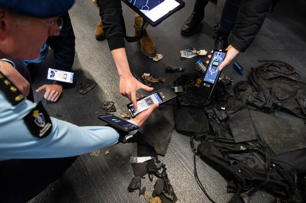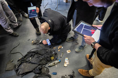 Een binnenscenario waarbij een stof is vrijgekomen na een explosie met een tas. De trainers hebben een groter tablet waarop de rode wolk van besmette zone zichtbaar is.