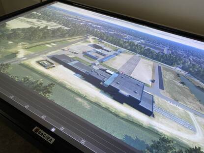 Op een enorm touchscreen kan de oefenleider het gehele trainingscentrum overzien.