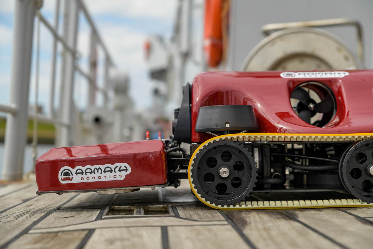 In de video zie je hoe de onderwaterrobot een slijmerige scheepsromp aanpakt.