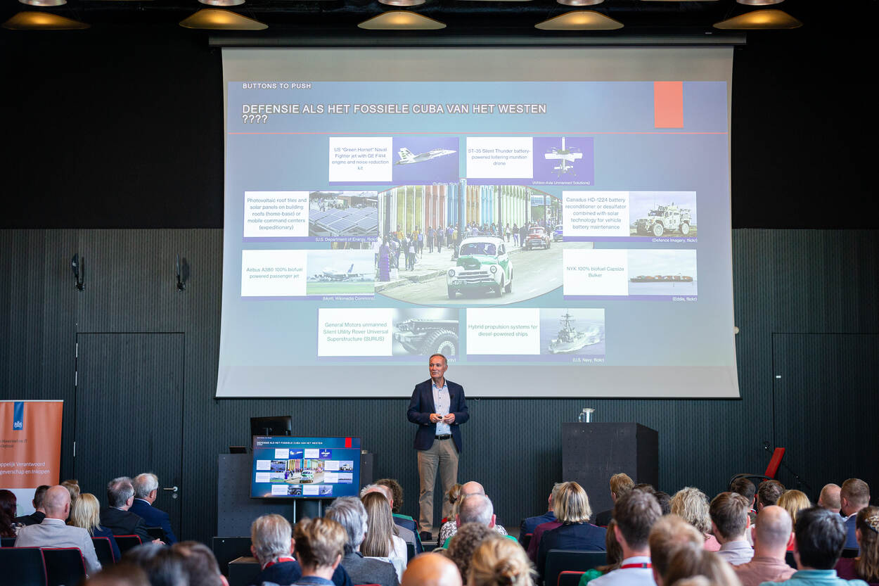 ‘Klimaatgeneraal’ en oud-commandant der strijdkrachten generaal Tom Middendorp kan natuurlijk niet op het appel ontbreken bij een congres waar ook circulariteit een thema is. Hij zag als directeur operaties bij Defensie dat spanningen in de wereld vaak te maken hebben met – tekort aan – water. “Vredesmissies lossen meestal de problemen niet op. Het is symptoombestrijding. Als CDS maakte ik pas de koppeling met klimaatverandering. Ook dat is een dreiging waarop Defensie zich moet voorbereiden. Het vraagt om innovatief denken, want er is een reële dreiging van tekort aan grondstoffen. Je kunt bijvoorbeeld wel op diesel blijven rijden, maar als iedereen op elektrisch overstapt, zit je straks met enorme onderhoudskosten en gebrek aan reservedelen. Circulariteit is een van de oplossingen.” En tot de inkopers: “Jullie zitten aan het stuur. Het begint met bewustwording.”