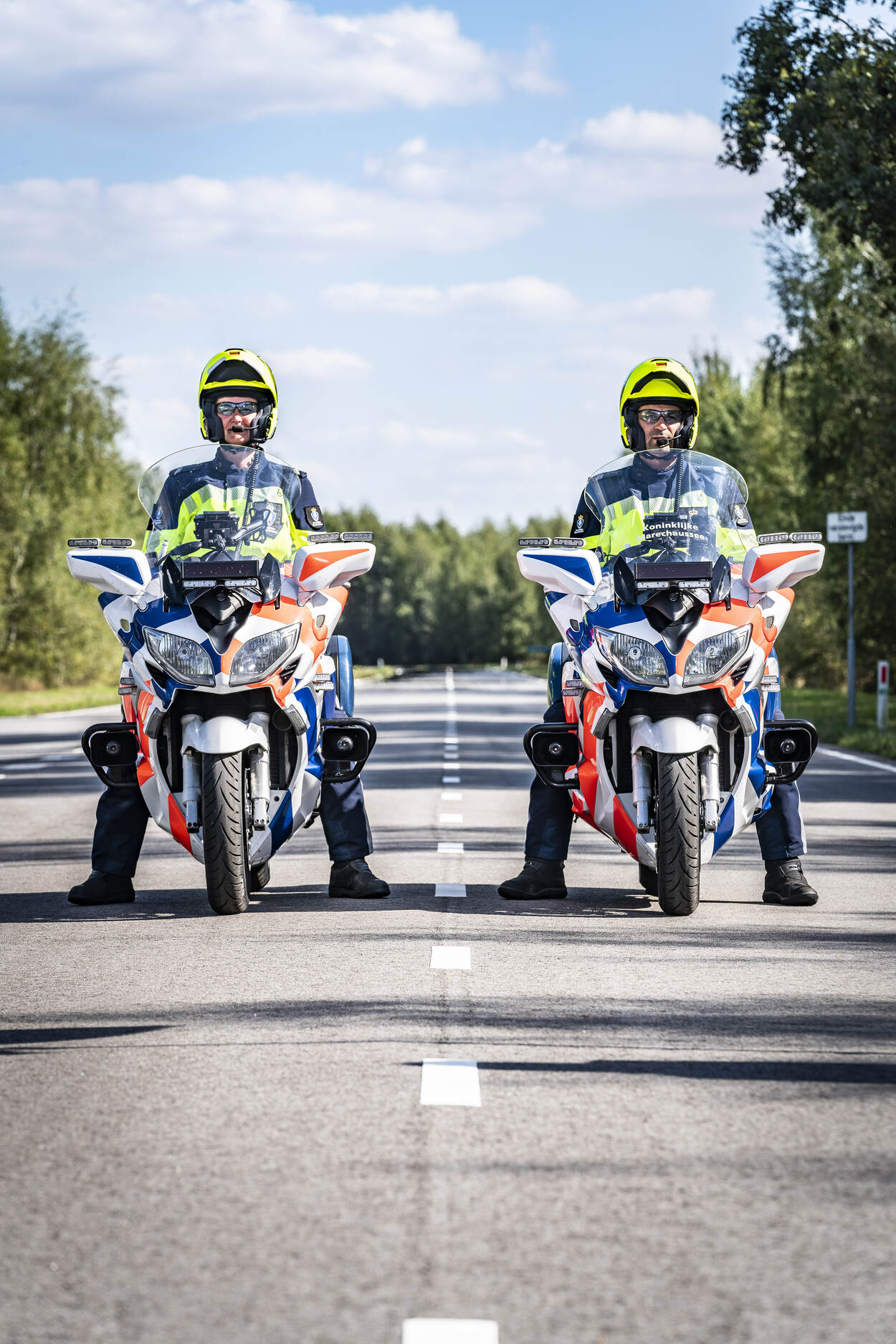 Het eerste dat opvalt aan het nieuwe pak? Het uiterlijk. Het traditionele blauw-wit-rode pak is verruild voor High Visibility-kledij met een fluorgele kleur. Zichtbaarheid was namelijk een heikel punt, vertelt Robert. De motorrijders staan regelmatig op een kruising. Een wit-grijzige omgeving, waarin het oude pak qua kleur visueel wegviel. Niet wat je wilt. “Door het felle geel zien weggebruikers je sneller, reageren ze beter en dat maakt ons werk weer veiliger.” Daarmee verandert het uiterlijk van de motorrijders op de weg. “De politie reed al langer in het geel rond en heeft hier goede ervaringen mee”, weet majoor Ton, dossierhouder Kleding en Uitrusting bij Staf KMar. De pakken van beide diensten lijken nu erg veel op elkaar. “Geen punt, aangezien we vaak met hen samenwerken: we zijn ook opsporingsambtenaren met dezelfde bevoegdheden als de politie. Uiteraard staat er wel groot ‘Koninklijke Marechaussee’ op het pak.” Ook tijdens een training van de Verkeerstechnische Begeleiding (VTB) werd het pak getest. Robert: “De één reed in het oude pak dichterbij, de ander in het nieuwe verderop. Hoewel die laatste in afstand het verst weg was, was degene in het nieuwe pak het best zichtbaar op het asfalt. De gele helmen werden al eerder uitgeleverd. Alles tezamen een hele verbetering.” Op de tender schreven verschillende bedrijven zich in: aan de hand van het pakket van eisen bleven er twee geschikte leveranciers over. Robert was begin 2022 één van de elf proefkonijnen die de potentiele rij-uniformen een maand lang mocht testen. Het testteam beproefde beide pakken in januari tijdens verschillende weersomstandigheden, om een eerlijke vergelijking te kunnen maken. Wat bleek? “Het ene pak was allesbehalve warm en ook niet waterdicht. Bovendien werd de High Vis bananengeel na een flinke regenbui.” Een schril contrast met het pak dat als winnaar uit de bus kwam. Een grote verandering is de stof. Naast ‘stoffen’ pakken waren een deel van de motortenues gemaakt van leer; het nieuwe pak is uitsluitend gemaakt van textiel. “Dit pak kwam niet enkel beter uit de test; Defensie is met dit pak ook de weg van duurzaam materiaal ingeslagen”, zegt Ton. Duurzaam, maar geen duurkoop. Het pak is namelijk gemaakt van een lichtgewicht doch robuuste textielsoort, die vaak wordt gebruikt voor motorpakken, outdoorkledij en rugzakken. De stof kan een zware last dragen en is goed bestand tegen slijtage, snijden en scheuren en is waterdicht. De materiaalkeuze brengt nog andere voordelen, merkt Robert op. “Het pak zit prettig om het lichaam, is warm en tegelijkertijd meer luchtdoorlatend door onder andere de ritsen onder de armen.” De adjudant vervolgt: “Dit pak is echt tot stand gekomen in samenspraak met het KPU-bedrijf en de leverancier. Dit was niet het goedkoopste pak… Er is goed geluisterd naar de testgroep, onze ervaringen en aanvullende wensen: wat wij nodig hebben om ons werk te kunnen doen.” In totaal worden er circa 350 sets pakken uitgeleverd. Het KPU-bedrijf levert de motorpakken uit, maar in dit project is nauw samengewerkt met een onderleverancier. Die draagt zorg voor het individueel aanmeten en passend maken van de motorpakken, waarna ze via KPU worden verstrekt. Hierdoor wordt het KPU ontzorgd en krijgt de militair het best passende product voor diens taak. “Als motorrijder krijgen we een zomerpak, ofwel het ‘doorwaaipak’, glimlacht Robert. Daarbij komen twee ‘all season’-pakken. De laatste keer dat er een nieuw motorpak werd uitgegeven is ongeveer vijftien jaar geleden. “Bedoeling is dat we er met dit pak weer jarenlang tegenaan kunnen”, zegt Ton. Lachend voegt Robert daaraantoe: “Al is de levensduur natuurlijk wel sterk aanvankelijk van de keren dat je het asfalt van dichtbij bekijkt.”