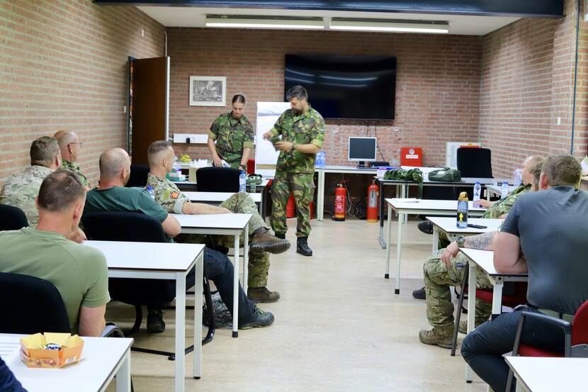Een opfriscursus ‘eerste hulp’ is dan een goed begin, bedacht Goutbeek. Vandaar dat steun is aangevraagd van deskundigen, in dit geval kapitein-arts Joep en soldaat-1 Inge, geneeskundigen bij 12 Infanteriebataljon Luchtmobiel. Er is heel wat veranderd sinds Munitietechnicus (Muntech) adjudant Jan het legergroen voor het eerst aantrok. Met hoofdstuk 10 uit het handboek Soldaat uit 1976 en de oorspronkelijke zelfhulp/kameradenhulp, beter bekend als ZHKH, kom je er niet meer. “Er zijn door ervaringen sterke verbeteringen doorgevoerd”, zegt de arts. “Mijn ideaal is trouwens dat alle militairen als CLS’er (combat life saver) zijn opgeleid. Dat geeft vertrouwen in elkaar.”