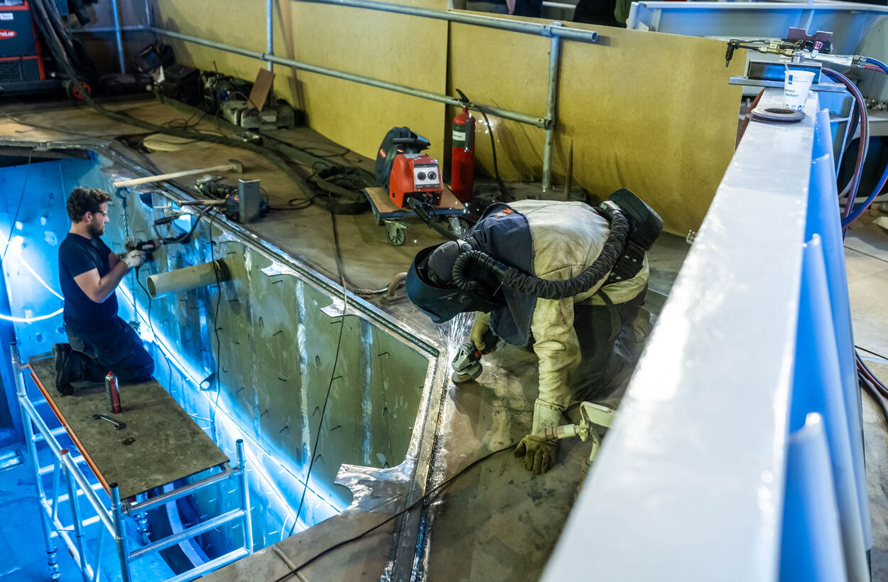 Technicus plaat- en scheepsbouw Leon Schouten kent de uitdagingen van het plaatsen van nieuwe constructiedelen op bestaande dekken, waar zich vervormingen vertonen door het varen. “Maar eigenlijk is dat vooral voor de engineers ingewikkeld; voor ons valt het wel mee, omdat wij meer op hun aangeven zorgen voor de uitvoering. Ons werk bestaat vooral uit het wegslijpen van oude delen en het lassen van fundaties voor de nieuwe dekken of verstevigingen in bijvoorbeeld de trimtank. Ik vind het mooi en spannend dat wij met een relatief jonge ploeg deze prestigeklus mogen doen. De doelstelling is uiteraard dat we volgend jaar een werkend eindproduct afleveren.”