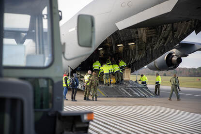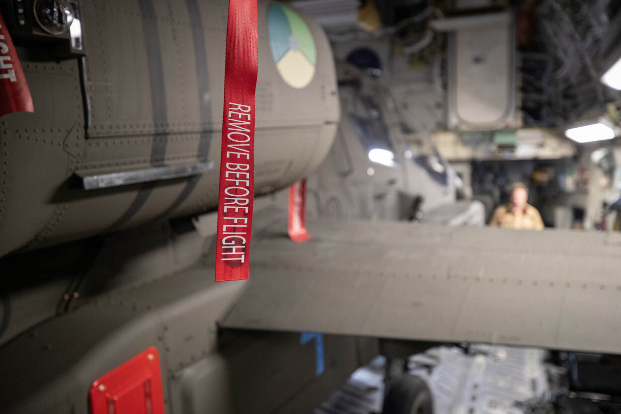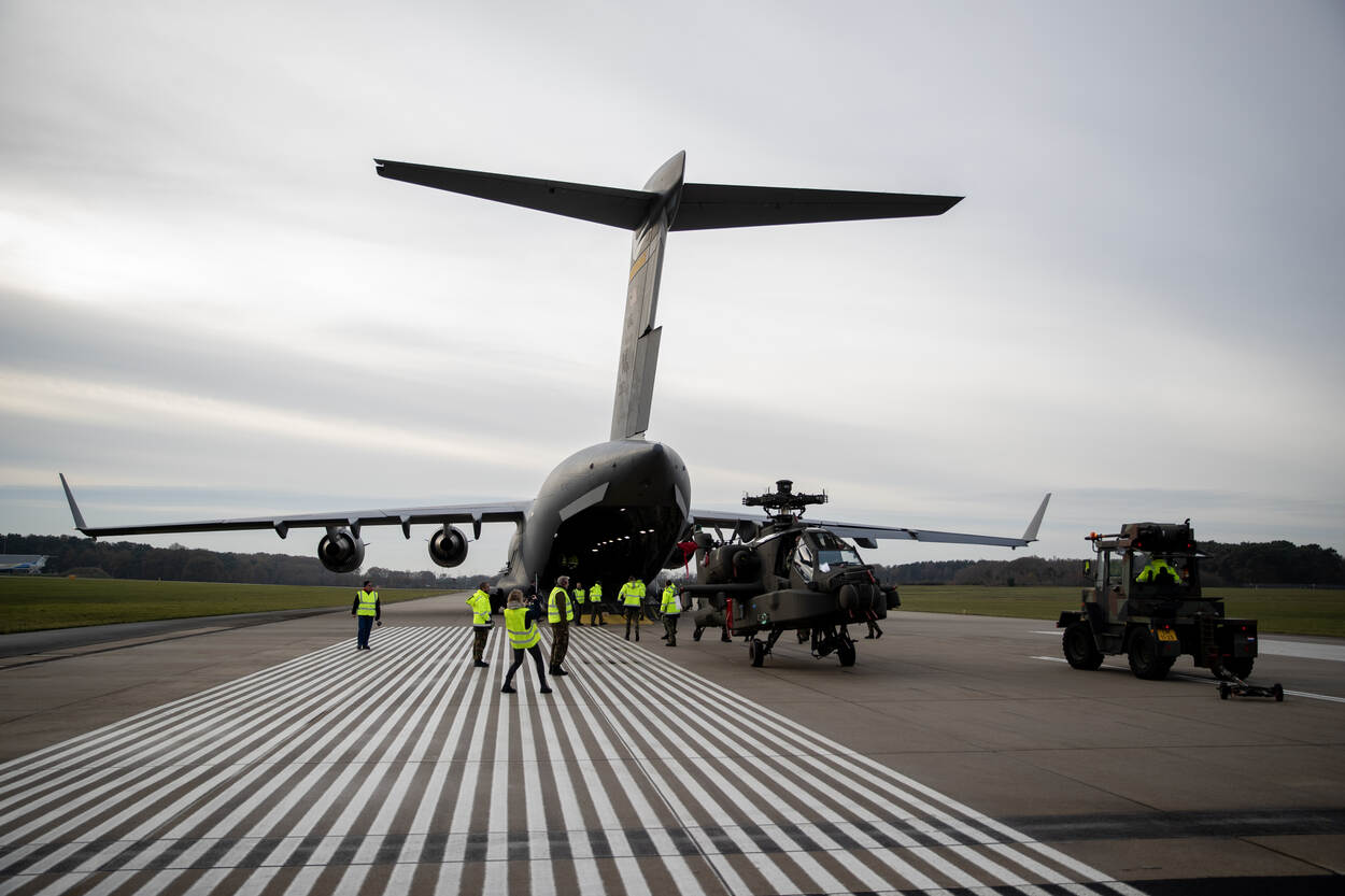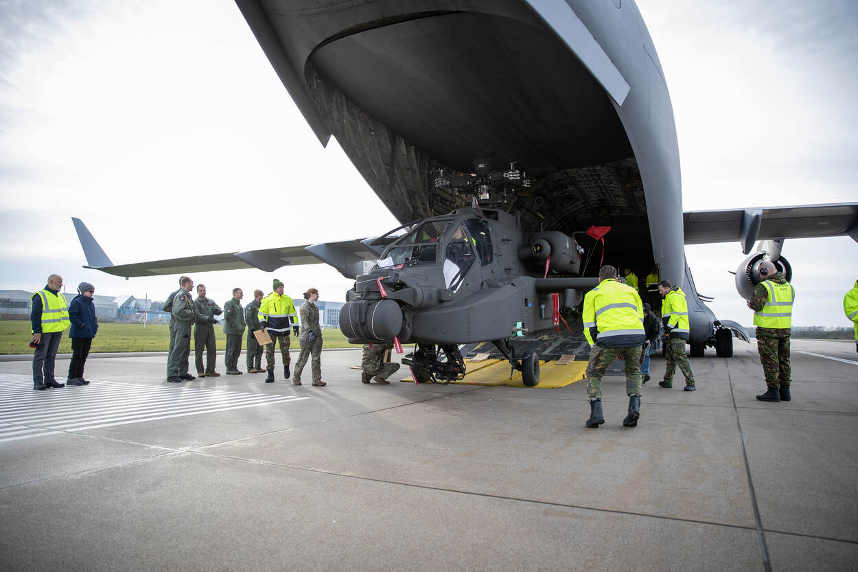 De snijdende winterwind is geen partij voor luitenant-kolonel John de Groot. Hoe lang het ook duurt om de toestellen uit de C-17 te krijgen, de projectleider van COMMIT zal met eigen ogen zien hoe deze twee Apache AH-64E’s van de ramp afrollen.