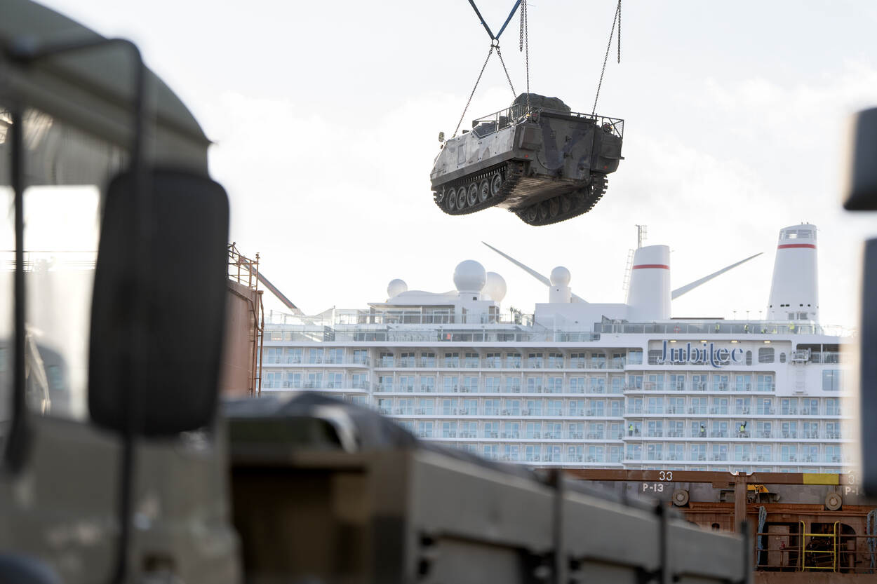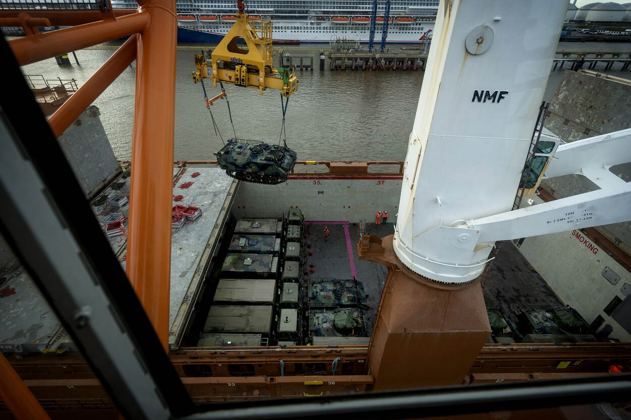 Het schip waarmee de 4-tonners en YPR’s worden vervoerd, is een door Jordanië bij een civiele reder ingehuurd load on/load off exemplaar. “Een land dat materiaal in het buitenland koopt is zelf verantwoordelijk voor het vervoer, wat ook geldt voor de ontscheping. Defensie heeft hier niets mee van doen”, leggen Jansen en Boering uit.