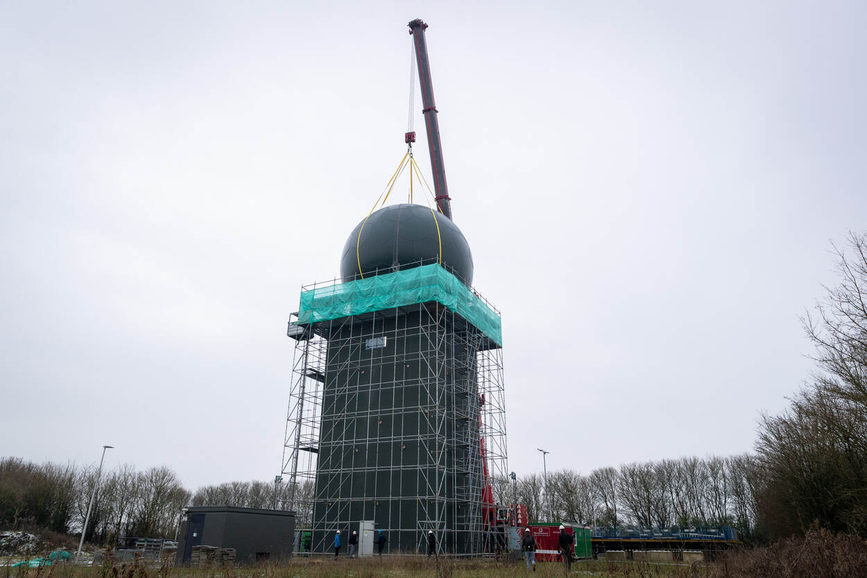 Als de wind rond het middaguur gaat liggen, hijst de kraan de Radome boven de radar. De kraanmachinist laat de koepel zakken op de twee meter hoge ring rondom de radar waarna zijn collega’s op de toren de Radome met touwen op z’n definitieve plek sturen.