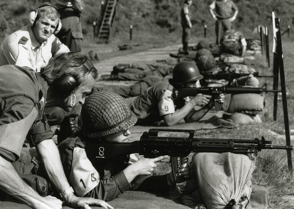 In 1964 waren deze militairen van de Kader School Infanterie in Vught een van de eersten die met de nieuwe FAL schoten.De nadagen van de FAL tijdens een oefening in 1996. De militair heeft twee magazijnen aan elkaar getaped en groene tape als camouflagepatroon op zijn geweer geplakt.