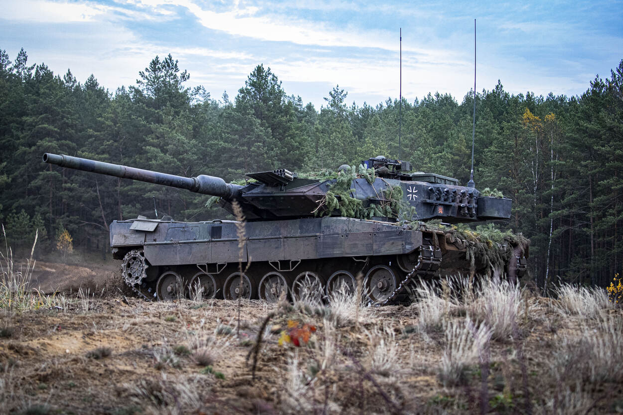 Vurende Leopard 2A6 in de bossen van Litouwen tijdens de oefening Iron Wolf in 2021.