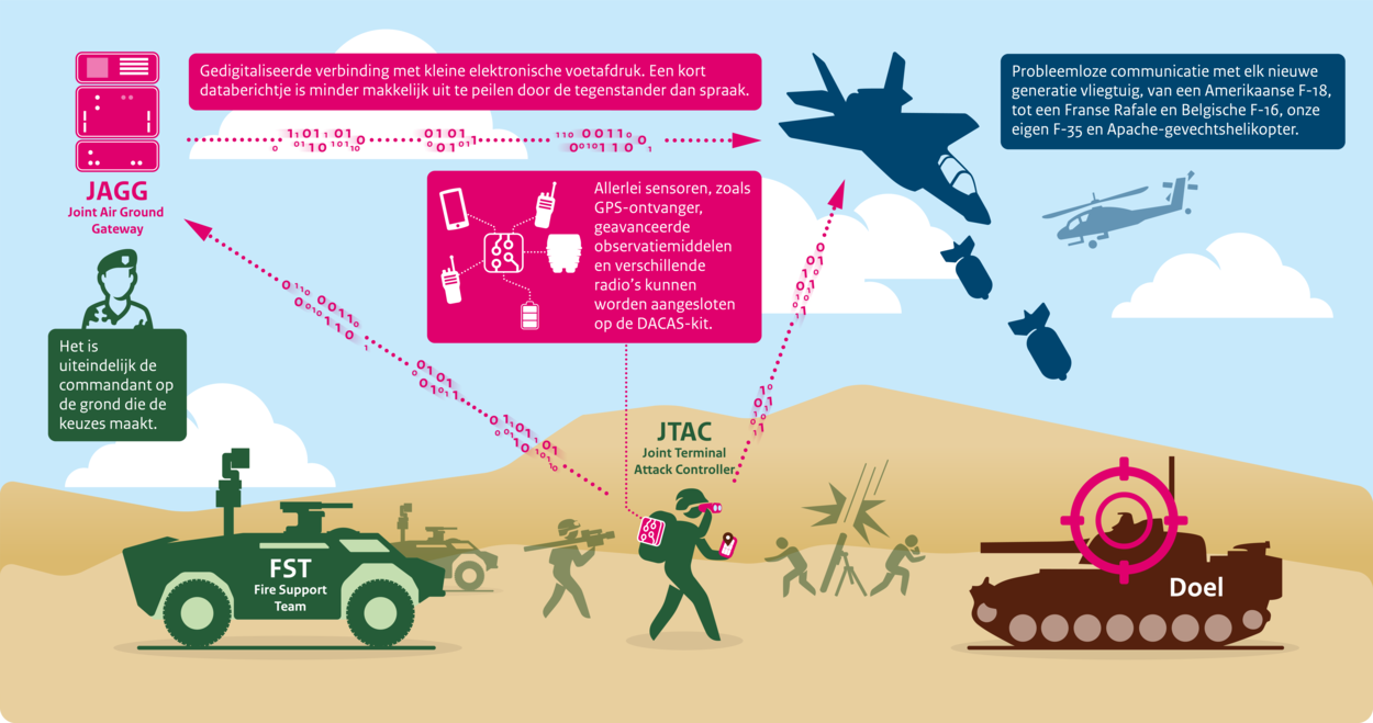 De JTAC beslist niet zelfstandig over inzet van wapensystemen, maar faciliteert die. Het is uiteindelijk de grondcommandant die de keuzes maakt. Zowel de verbindingen naar de vliegende eenheden als het bataljon en de brigade zijn binnen het Joint Fires-project gedigitaliseerd, vertelt projectleider vanuit Directie Projecten Danny: “Voor de brigade zorgt de nieuwe Joint Air Ground Gateway (JAGG) daarvoor. Die haalt de DACAS-gegevens van de JTAC op en kan het luchtbeeld van vliegende platformen bekijken. Door de JAGG en DACAS kit wordt de informatie-uitwisseling versneld en heeft de brigadestaf een bijna real time beeld, dat gesynchroniseerd kan worden met de JTAC en vice versa.”