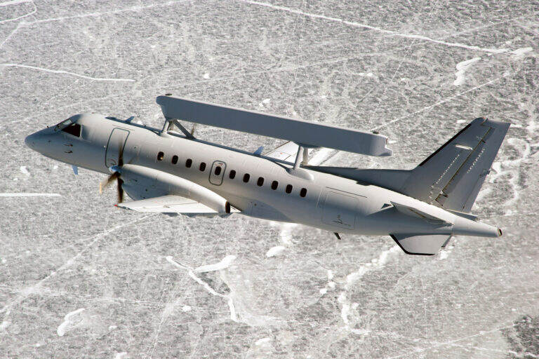 De Saab ASC 890 is een variant van de Saab 340 AEW (foto), gebaseerd op het regionale turbopropvliegtuig Saab 340. Dit vliegtuig is uitgerust met het Erieye Airborne Early Warning and Control (AEW&C)-systeem, met een actieve elektronisch gescande array (AESA) radar bovenop de romp. Het heeft een bereik van meer dan 550 kilometer en kan zowel vliegende als varende doelen effectief volgen. (foto: Saab)