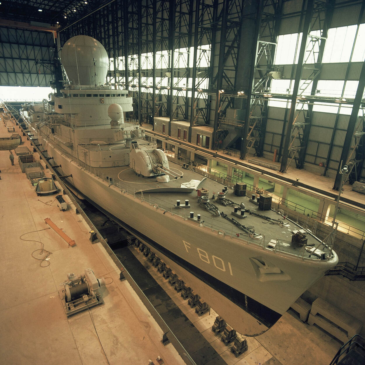 Het Geleide Wapenfregat Hr.Ms. Tromp (1975-1999) met Bofors 12cm kanon op de bak in dok VI op de Rijkswerf te Den Helder.