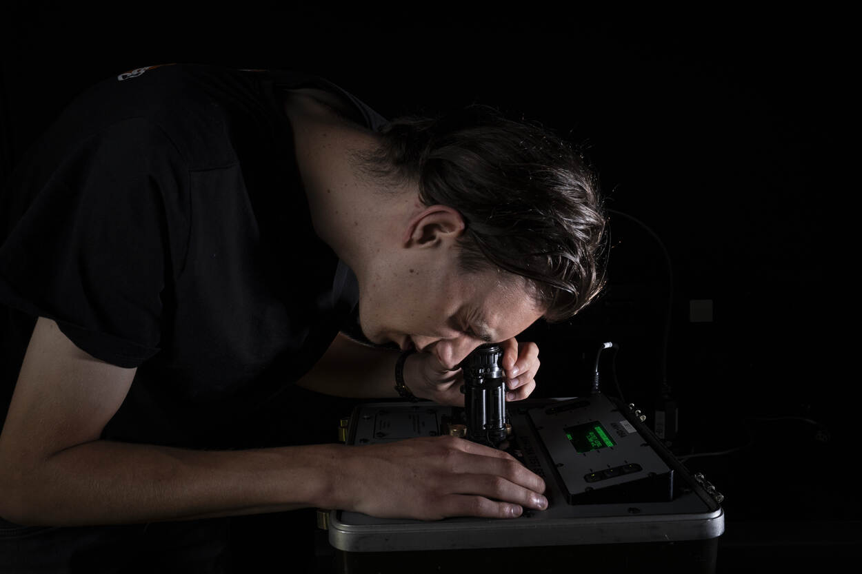 Met het licht van de maan en sterren een zichtbaar beeld door de kijker krijgen. De nachtzicht-techniek fascineert Tim mateloos. Net als Thijs volgde hij een mbo-opleiding engineering en kon na zijn stage bij DMI door als vaste medewerker. “Je zit niet alleen hier maar gaat door heel het land en soms naar het buitenland. Dat spreekt me erg aan”, vertelt Tim naast een bak met defecte nachtkijkers voor op de helm. “Het licht in zo’n kijker wordt wel 10.000 keer versterkt. Het bekende groene beeld komt door de fosforlaag. Die heb je in meerdere kleuren maar groen is het prettigst voor de ogen.”