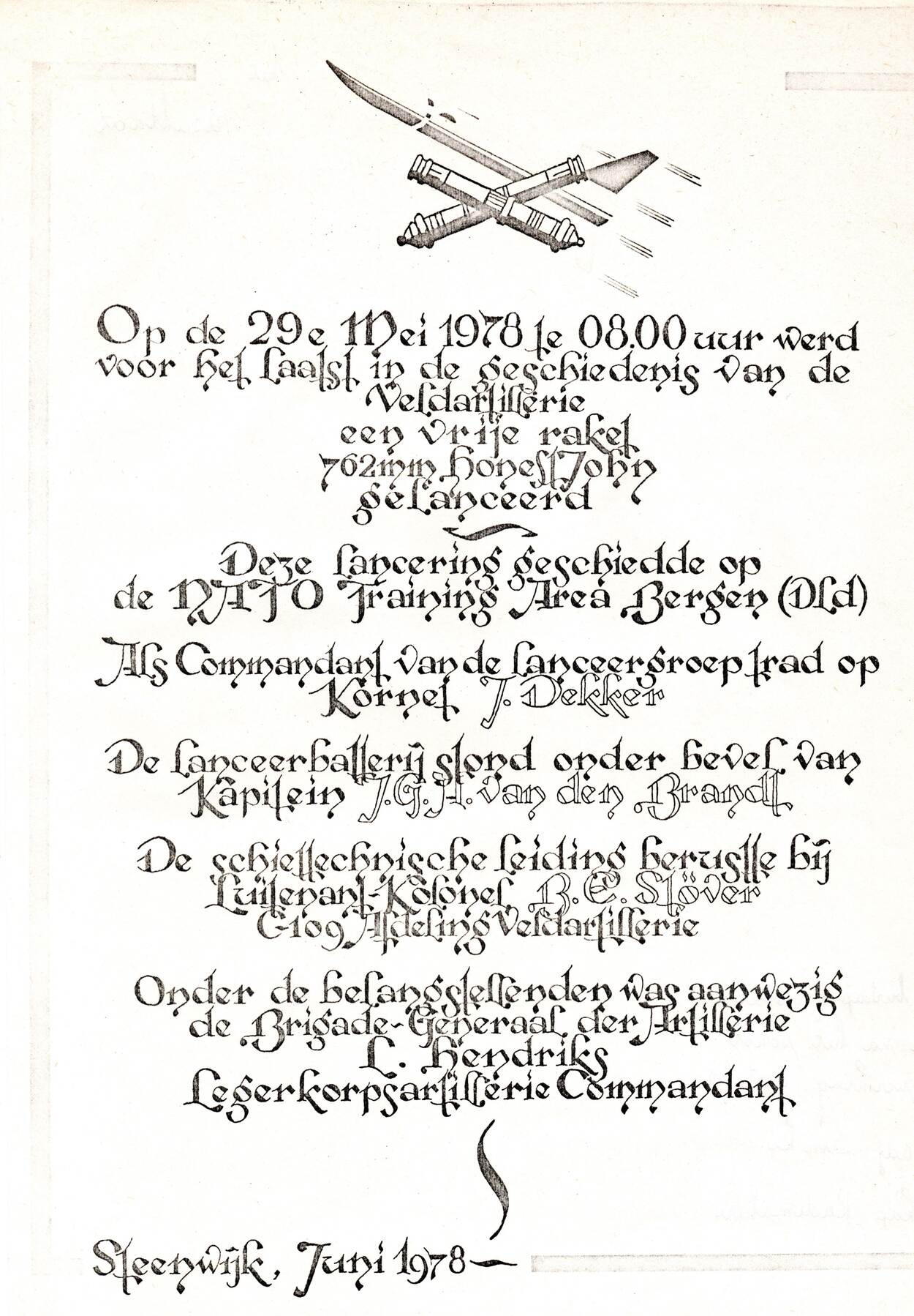 Als stukscommandant moest Middel ervoor zorgen dat de drill door zijn kanonniers goed werd uitgevoerd. Vooral het stelling nemen en juist richten van de lanceerinrichting en raket vereisten aandacht. In Duitsland werd scherp geschoten en het Fire Record Book behorende bij de lanceerinrichting ‘Condor’, dat de voormalig wachtmeester al die tijd heeft bewaard, laat een bijzonder moment zien: de handtekening voor het laatste schot met de Honest John, op 29 mei 1978. “Misschien kregen wij het laatste schot omdat we zo goed op elkaar waren ingespeeld.”