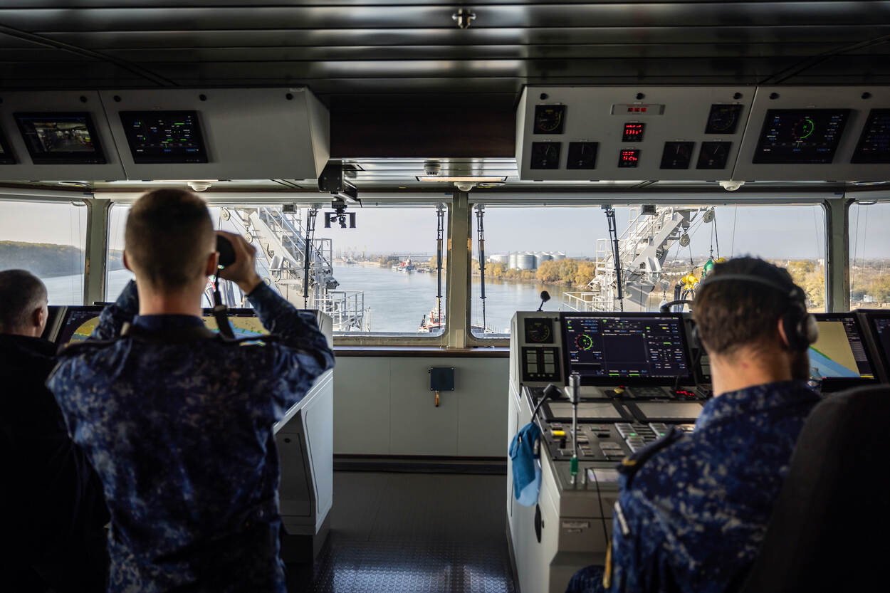 Voor de liefhebber zou het best een mooie cruise zijn, maar daar heeft dit traject niks mee te maken. Voor het Combat Support Ship Den Helder (CSS) is het geen snoepreisje. Het is de maiden trip van het nieuwe bevoorradingsschip van de Koninklijke Marine. “Mijn eerste indruk is dat ze fijn vaart”, zegt kapitein-luitenant ter zee (KLTZ) Stefjan, de commandant van de Den Helder. “Het reageert goed, haalt de goede snelheden en ligt stabiel in het water. Qua vaareigenschappen voldoet ze aan het plaatje.”
