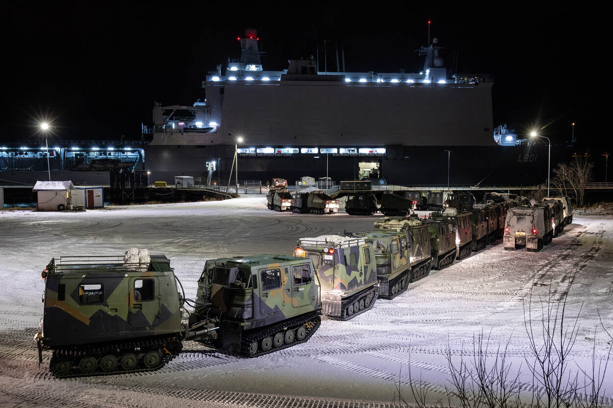 Mariniers, voertuigen en materieel worden tijdens Joint Viking vanaf Zr.Ms. Johan de Witt aan land gebracht.
