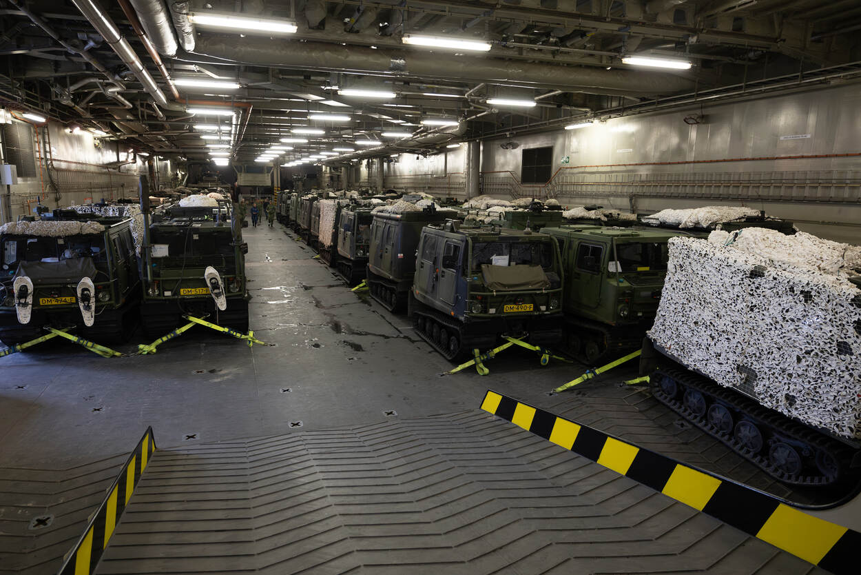 (beide onderstaande foto’s): Zr.Ms. Johan de Witt biedt ruimte aan grote aantallen mariniers, voertuigen en materieel.