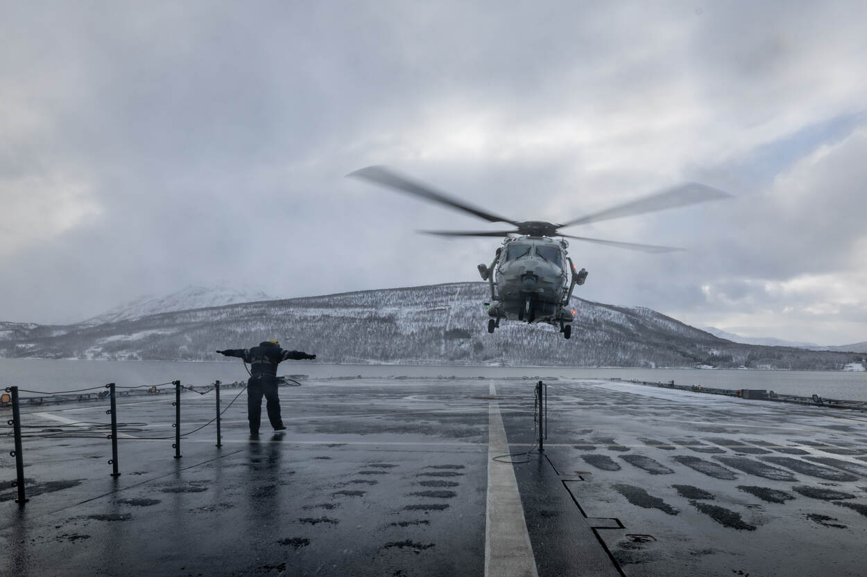 NH90-maritieme gevechtshelikopter landt op dek Zr.Ms. Johan de Witt.