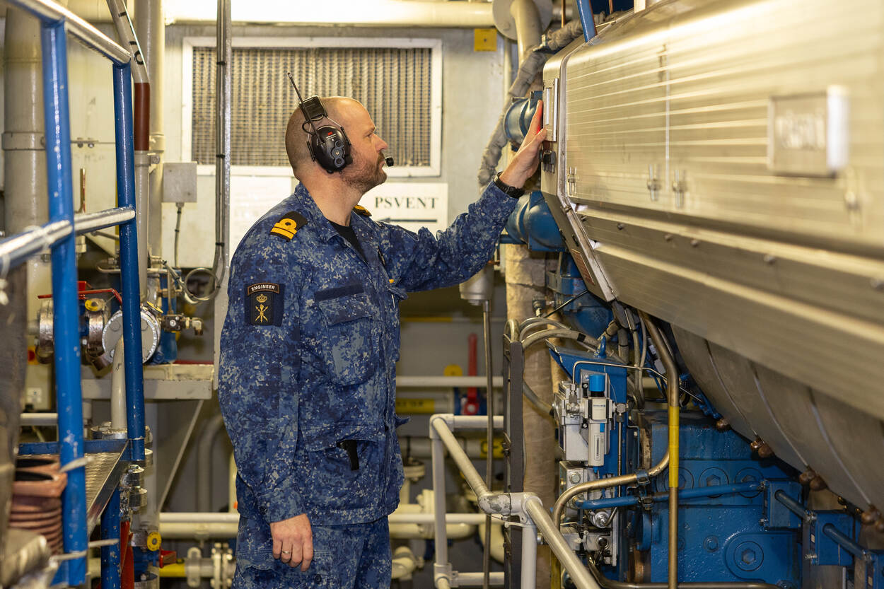 Het onderhoud aan een schip als een LPD, en eigenlijk elk marineschip, gaat dag en nacht door. De officiële werktijden van Mitch zijn van half 8 ’s morgens tot kwart over 4 ’s middags. Als hij aan het begin van de dag de taken voor onderhoud en controle heeft verdeeld, besteedt hij zijn tijd aan de korte- en langetermijnplanning om het voortzettingsvermogen te garanderen. Onderdelen moeten op tijd worden besteld en periodiek onderhoud, na 500, 1.000 en 1.500 vaaruren, moet worden ingepland. “Ik heb doorlopend contact met de collega’s van de Directie Materiele Instandhouding (DMI) voor het plannen en uitvoeren van onderhoud. Het meeste onderhoud is planbaar. In het geval van storingen zijn procedures ingericht om deze zo snel mogelijk te verhelpen. Tijdens een oefening in 2024 hebben we een koerier uit Nederland naar Tromsø, Noorwegen, laten rijden met een printplaat voor een wapensysteem.”