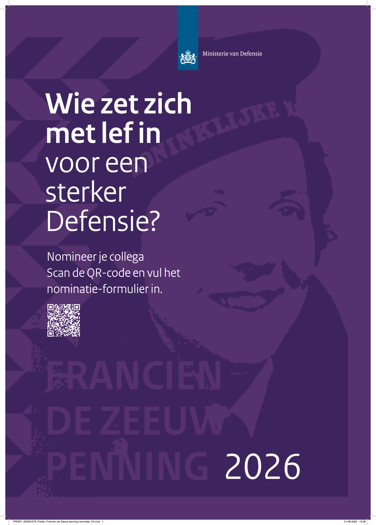 Ken jij nou een collega, een kennis, of buddy, die boven het maaienveld uitsteekt, of die juist op persoonlijk niveau dat verschil maakt? Nomineer deze persoon dan voor de Francien de Zeeuw-penning 2026 en help om hun werk zichtbaar te maken! Vul het nominatieformulier compleet in via https://doscoportal.mindef.nl/sites/0300/088/SitePages/FdZ.aspx.