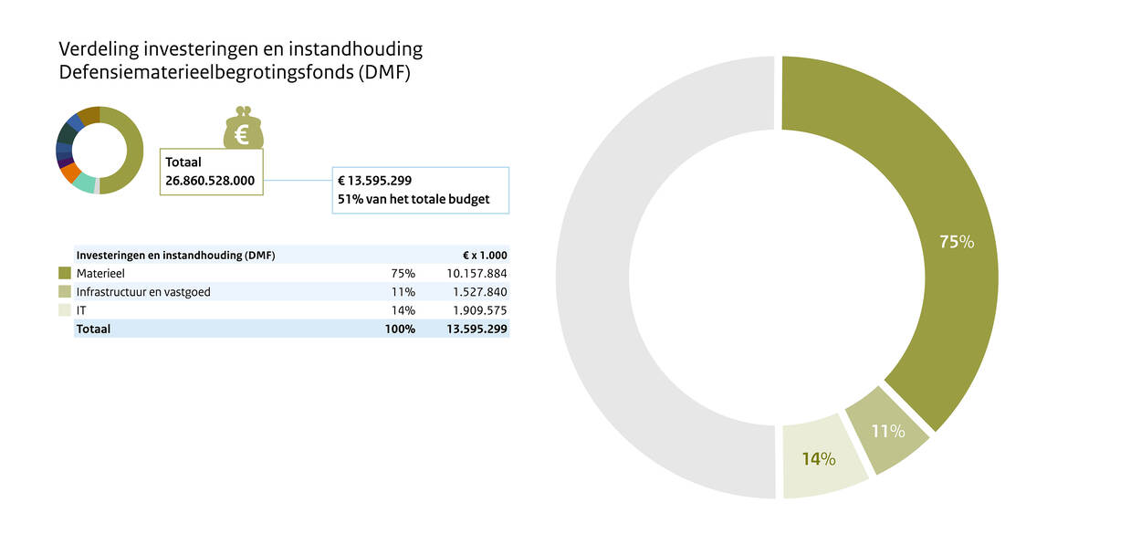 Volgens het Overzicht uitgaven 2026 is ruim 13 miljard euro voor ‘Instandhouding en verwerving van defensiematerieel’. Ongeveer een kwart gaat naar infrastructuur, vastgoed en digitalisering. Het gros van die 13 miljard euro is bestemd voor materieel. Denk aan voertuigen, schepen, vliegtuigen, bewapening, kleding en uitrusting. Verder steekt Defensie geld in lucht- en raketverdediging en in munitievoorraden. Voor 2025 ligt Defensie op koers om de begroting te realiseren.