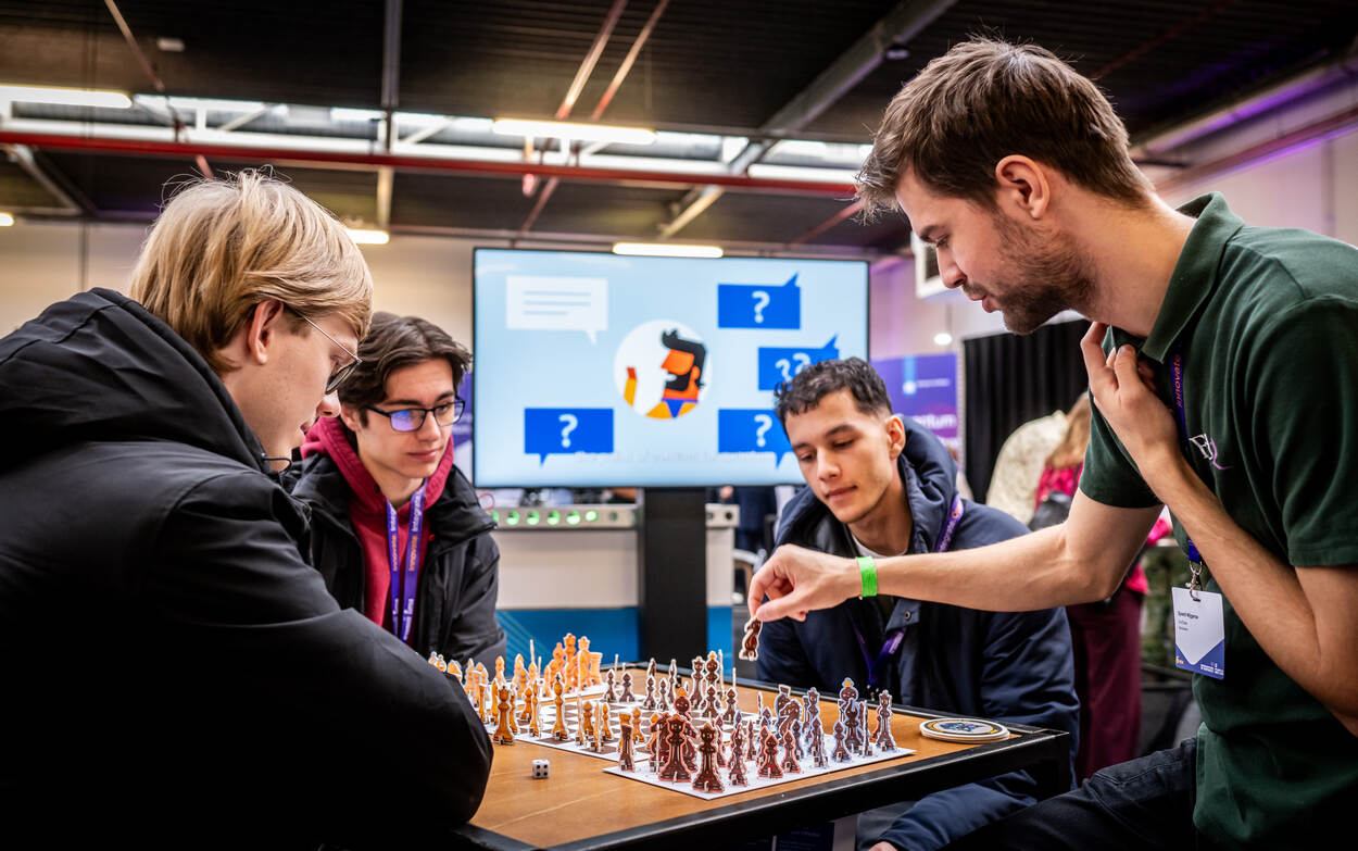 Kwantumtechnologie is nu al de toekomst. Bij de meeste mensen houdt de kennis van deze vooruitstrevende technologie op bij het woord kwantum. Om dat te veranderen is er EduQuation uit Eindhoven. Sjoerd (rechts op de foto) en een bevlogen team van studenten gaat langs scholen, bedrijven en kennisinstituten om op simpele wijze uit te leggen wat kwantum inhoudt. “Voor veel mensen is deze technologie ongrijpbaar en daarom misschien zelfs een beetje eng”, erkent Sjoerd. EduQuation introduceert kwantummechanica op een speelse manier met de hulp van bordspellen (foto), video- en een virtual reality-spellen, zoals een zelf ontworpen schaak-dobbelspel. “We willen met name kwantummechanika toegankelijker maken en de volgende generatie inspireren, zodat ze er al aan gewend zijn. We merken hier op Purple NECtar X Innovation in Defence dat degenen die onze kwantum gameroom betreden heel nieuwsgierig zijn.” En dat is belangrijk, want om in schaaktermen te blijven: wie straks niet meekomt in de wereld van kwantummechanica, staat schaakmat.