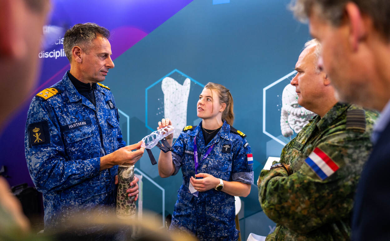 Je kon er niet omheen tijdens Purple NECtar X Innovation in Defence: de zwarte gevaartes die uit de 3D-printer zijn gerold, zoals deze grote boot. Het bedrijf dat deze klus in slechts 8 dagen tijd klaarde is CEAD, gevestigd in Delft. Dat gebeurde in samenwerking met het Expertisecentrum Addittive Manufacturing van de Koninklijke Marine. CEAD richt zich op de ontwikkeling en productie van grootschalige 3D-printers. Met gebruik van thermoplastische composietmaterialen zijn daarmee inmiddels boten geprint tot circa 12 meter lengte, ontworpen voor zowel civiele- als defensietoepassingen. En dat vindt commandant COMMIT vice-admiraal Jan-Willem Hartman belangrijk: de zogenoemde dual use. CDS generaal Onno Eichelsheim was net als de bezoekers onder de indruk.