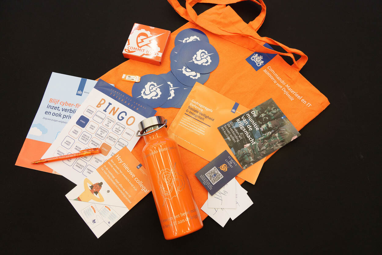 Het boardingsprogramma start na het arbeidsvoorwaardengesprek en de screening. De nieuwe medewerker ontvangt thuis een brievenbuspakket. Daarin zit een sleutelhanger en een etui, gemaakt van duurzaam gerecyclede militaire kleding. Verder een notitieboekje en een welkomstbrief van de commandant. Hierin staat ook hoe je de COMMIT preboarding app start. “Dit is de eerste diepere kennismaking met onze organisatie”, aldus Rob. In de app krijg je stap voor stap informatie over Defensie, COMMIT en de directie waarbij je aan de slag gaat. Je hebt ook de mogelijkheid om andere directies van COMMIT te leren kennen. “Gaaf om te zien dat nieuwe medewerkers het brievenbuspakket delen met hun netwerk op social media platforms. Een leuke win-win die ook afstraalt op Defensie.”