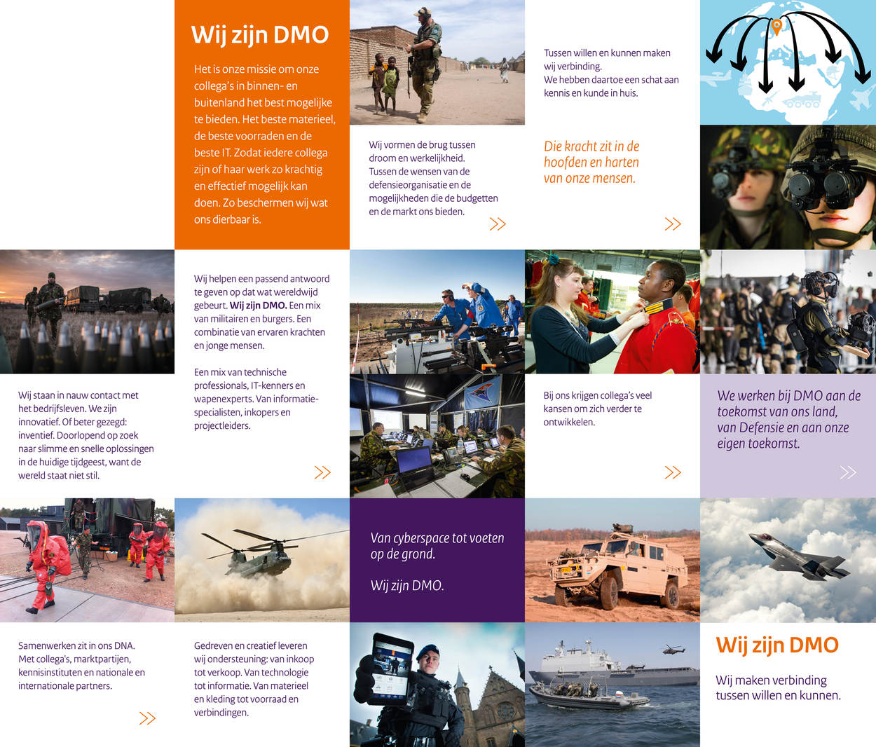 >> Wij helpen een passend antwoord te geven op dat wat wereldwijd gebeurt. Wij zijn DMO. Een mix van militairen en burgers. Een combinatie van ervaren krachten en jonge mensen. Een mix van technische professionals, IT-kenners en wapenexperts. Van informatie-specialisten, inkopers en projectleiders.