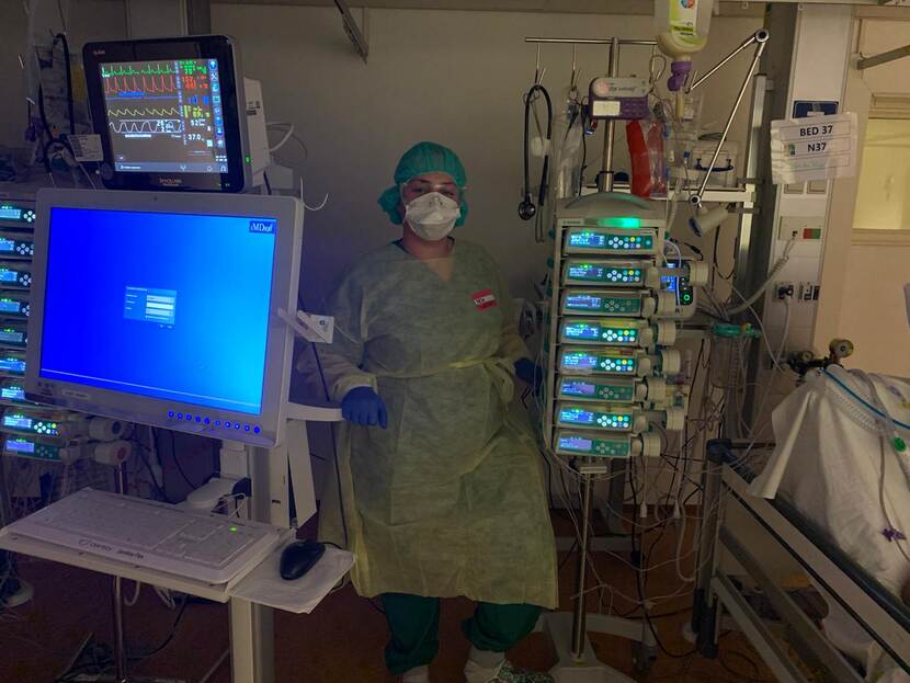 “Ik zou beginnen met mijn AMV-opleiding, toen de marine vroeg of ik ingezet wilde worden voor corona. Ik heb een verpleegkundige-diploma uit de burgermaatschappij op zak en zat thuis omdat de opleiding stillag. Inzet in een burgerziekenhuis leek me vaktechnisch interessant en ik wilde helpen. In Ede kon ik kiezen tussen SEH en IC. Het werd de laatste. Spannend, dit werk had ik nog nooit gedaan. Het was qua coronapatiënten ‘volle bak’. 70 procent van de tijd stond ik ingepakt in beschermende kleding op een ziekenkamer, nam bloed af, draaide patiënten om, stelde apparatuur in, gaf medicatie. De 12-uursdiensten waren pittig. Het mooiste was als een patiënt van de beademing af kon. Er waren ook mindere momenten, zoals toen ik iemand voor het eerst in mijn loopbaan moest afleggen. Ik schrok, maar wist de knop om te zetten. Ondanks corona was mijn tijd in Ede leuk en interessant.”