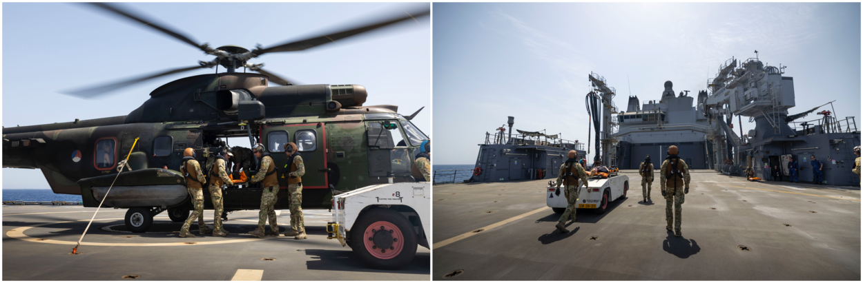 De helibemanning, flightnurses en opvarenden van de Karel Doorman beoefenen de afvoerketen van een medevac.