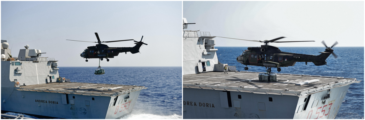 Het overzetten van voorraden was een van de taken voor de Cougar-boordheli. Hier wordt de Italiaanse destroyer Andrea Doria bediend. Foto’s: 300 Squadron