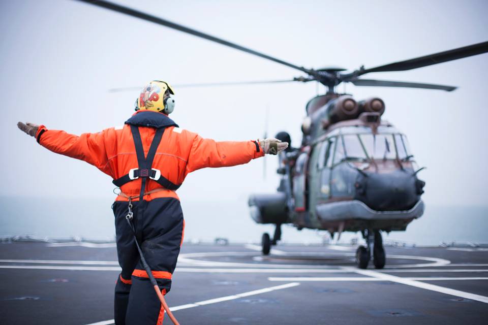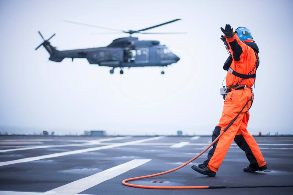 Vliegdekofficieren loodsen de Cougars binnen op en weer weg van het helikopterdek van Zr.Ms. Johan de Witt.Deze marinier is een vliegdekofficier. Hij zorgt ervoor dat de vlieger en zijn bemanning de juiste aanwijzingen krijgt om veilig te landen.