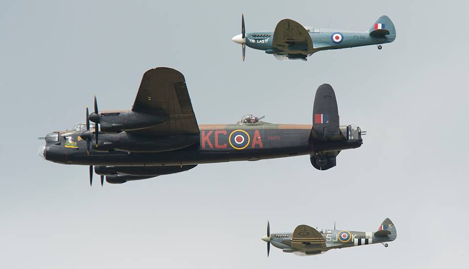 de Battle of Britain Memorial Flight met een Lancaster en 2 Spitfires. Juist in