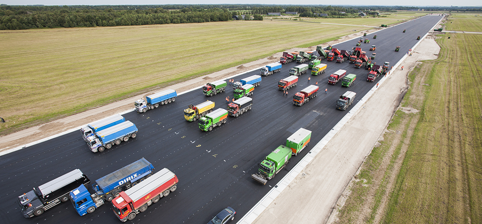 Eind augustus kreeg de nieuwe baan op Volkel zijn gezicht. 9 asfaltmachines voorzagen het traject gelijktijdig van een deklaag. Daadoor ontstond een naadloos oppervlak. De hoofdbaan van het F-16-veld wordt sinds mei gerenoveerd. De nieuwe fundering is gemaakt van deels gerecycled materiaal van de oude baan. Naar verwachting zijn alle werkzaamheden in november afgerond. Foto: sergeant-majoor Arnoud Schoor