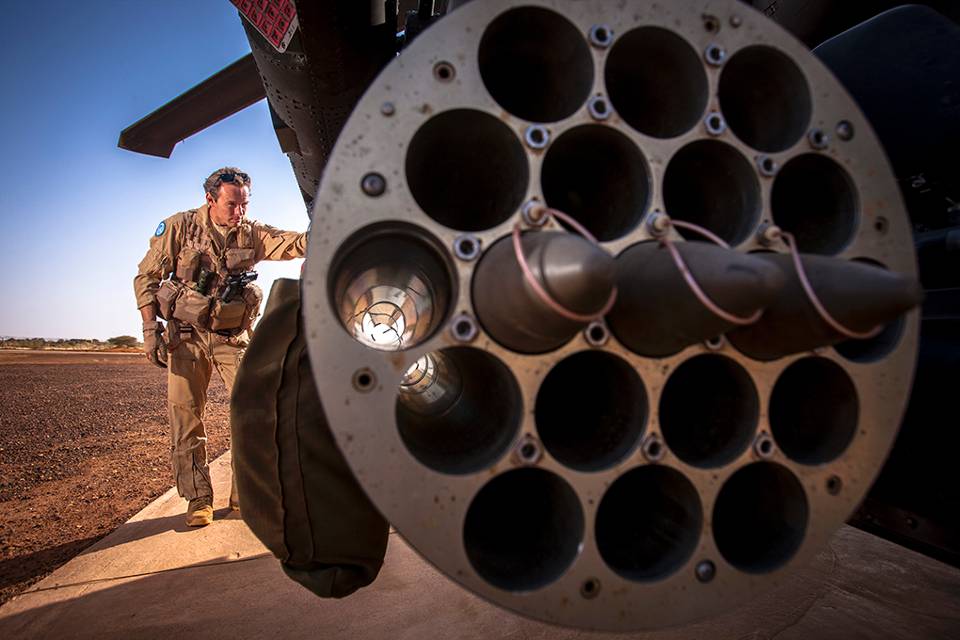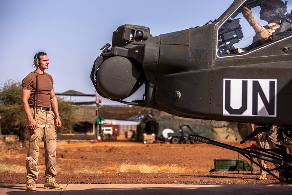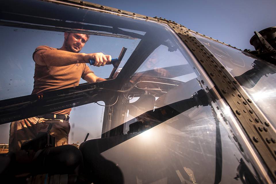 Eerste-luitenant Sebastiaan inspecteert zijn Apache vlak voor vertrek van een verkenningsvlucht voor de VN-missie Minusma.