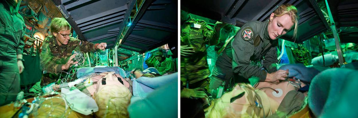 Hier is ook voor de flight crew een belangrijke rol weggelegd. Gezagvoerder majoor Marcel: “De aard van de verwondingen van de patiënten heeft invloed op de uitvoering van de vlucht. Zo kan ik bij zwaargewonden bijvoorbeeld niet te hard accelereren op decellereren. En kan ik bij een patiënt met een longaandoening niet te hoog vliegen omdat de luchtdruk dan voor problemen kan zorgen. Laag vliegen kost dan weer meer brandstof…”