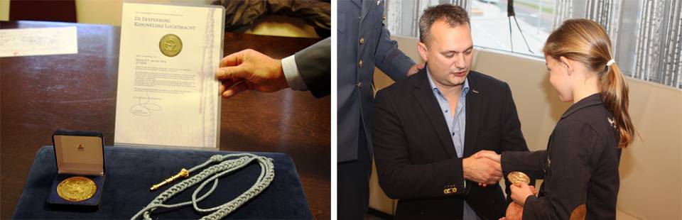 Een stuk pannenkoek dat de 6-jarige Florence vorig jaar letterlijk in het verkeerde keelgat schoot, werd haar bijna fataal. Door adequaat handelen van majoor Bernie van den Berg, gezagvoerder op de C-130, ontsnapte zij aan de verstikkingsdood. Ze heeft er zelfs geen enkel letsel aan overgehouden. Voor de levensreddende handeling ontving de majoor ruim een jaar later op 18 november de Erepenning Koninklijke Luchtmacht. Florence, het vriendinnetje van de kinderen van Van den Berg, had zelf de eer deze te overhandigen op het stadskantoor van de gemeente Breda. De gezagvoerder is daar momenteel ook wethouder. Voor die functie krijgt hij sinds dit jaar buitengewoon verlof van Defensie.