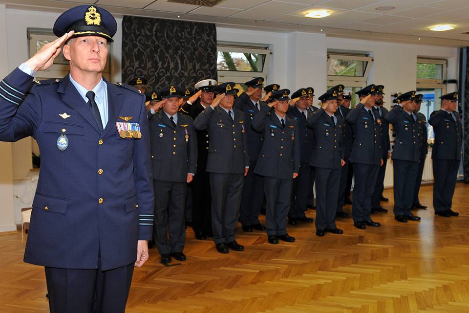 Dit laatste onderstreept het multinationale karakter van NAVO’s AWACS-eenheid in Geilenkirchen, waar militairen uit 16 NAVO-landen samenwerken. Plaatsvervangend Commandant Luchtstrijdkrachten generaal-majoor Emile van Duren en burgemeester van Brunssum Luc Winants, de buurgemeente van Geilenkirchen, reikten de versierselen uit. Foto: E-3A Component