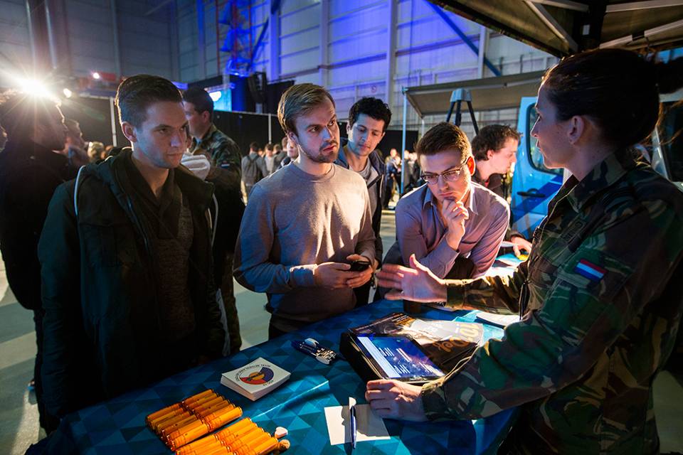 Zo’n 300 nieuwsgierige, deels ook stage- of baangierige HBO’ers en universitair geschoolden bezoeken de infodag op de eerste woensdag van december. Ze ‘sponzen’ aandachtig alle carrièremogelijkheden bij de krijgsmacht op. “Defensie is veel breder georiënteerd dan vechten alleen,” merkt student werktuigbouwkunde Stefan Dijkman (21) op. “Er zijn veel meer technische functies dan ik dacht.” En dat je die zowel als burger en als militair kunt vervullen, is voor sommigen ook een eye opener.
