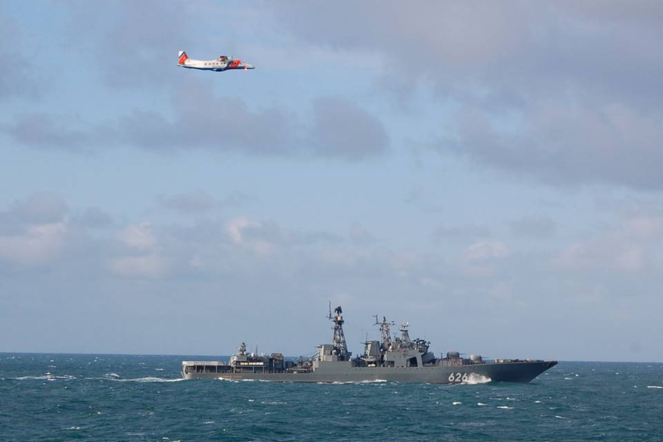 De Schepen, torpedobootjager Viceadmiral Kulakov en ondersteuningsvaartuig Vikr, passeerden Nederland op weg van de Middellandse Zee naar hun thuishaven. De Groningen nam de begeleiding over van de Britse HMS Portland, een Belgische helikopter en het Belgische Maritiem Informatie Kruispunt toen de Russische schepen de Nederlandse Exclusieve Economische Zone binnenvoeren. Foto: Defensie