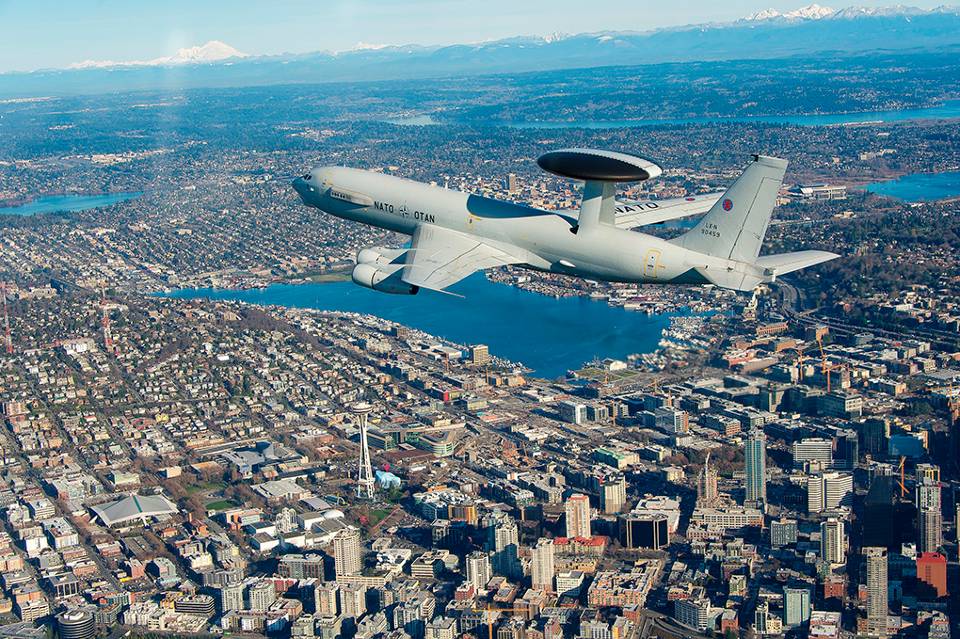 USAF en de NAVO werken samen in de ontwikkeling van de Airborne Early Warning and Control Systems (AWACS), maar voeren de updates los van elkaar uit. De eerste NAVO-AWACS arriveerde in augustus 2013 in Seattle en maakte de eerste vlucht na modificaties op 31 december. Het toestel wordt naar verwachting volgend jaar afgeleverd op Geilenkirchen. De rest van de vloot moet in 2018 gemodificeerd zijn. Foto: John Parker – The Boeing Company