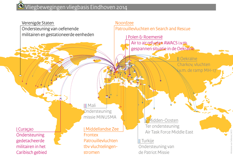 2014 is een bijzonder jaar voor de vliegbasis Eindhoven. “Veel bijzondere activiteiten naar aanleiding van de situatie in de wereld,” geeft de commandant aan, “en dat is te zien in onze vliegactiviteiten. Daarnaast is er de constante – geplande – groei van de luchthaven. Ik vind het een prestatie dat we al die vliegbewegingen met zo weinig mensen voor elkaar krijgen. We zeggen nooit ‘nee’ en leveren veel diensten aan heel Defensie en buitenlandse eenheden. Met het European Air Transport Command hebben we op Eindhoven een goed voorbeeld van Europese samenwerking.”