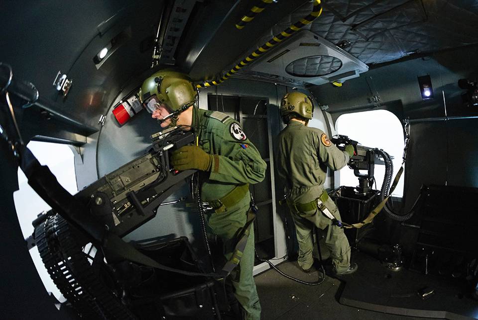 Zorgvuldig stijgt adjudant Paul Arends op met een NH90 van Marinevliegkamp De Kooy. Niet in het echt in Den Helder, maar in de nieuwe doorgunner simulator op Gilze-Rijen. “Je waant je meteen écht boven De Kooy. Hiermee kunnen we de doorgunners voor zowel de Chinook als de Cougar of de NH90 opleiden. Deze simulator overtreft alle verwachtingen die we aan het begin van dit project hadden.”
