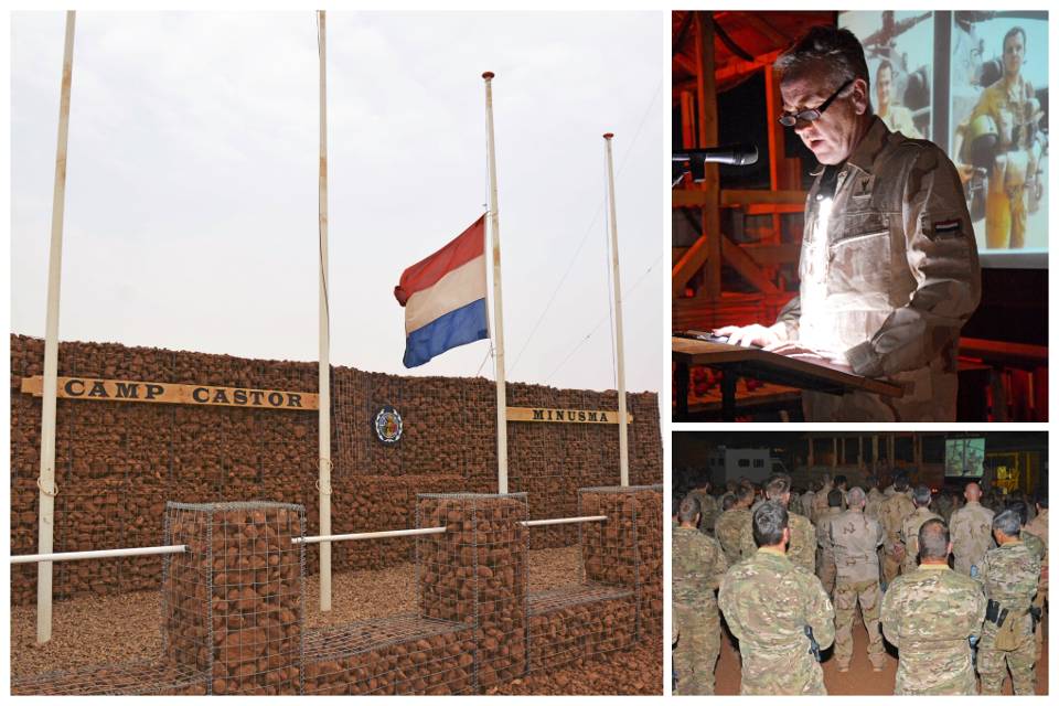 Speciaal voor de ramp ceremony vliegen sergeant-majoor John Bessems – trompettist van de Kapel van de Koninklijke Luchtmacht – en doedelzakspeler adjudant Ronald Collenteur naar Mali. Na de speech van de dominee speelde Bessems de ‘Last Post’. Collenteur loopt daarna voor de twee draagploegen uit.” Hij speelt de hymnes ‘Amazing Grace’ en de Schotse doedelzaktraditionals ‘The Dark Island’ en ‘Highland Cathedral’. “Alleen en doedelzak spelend voor een militaire rouwstoet uitlopend, is – voor zover ik weet, voor Nederland uniek”, zegt de werkvoorbereider mechanische systemen Chinook van het 980 Vliegtuig- en Helikopteronderhoud Squadron. “De reis en het optreden was onwerkelijk en is als een film aan me voorbijgetrokken. De enorme erehaag van saluerende collega’s is me het meest is bijgebleven. Het was al met al een onvergetelijke ervaring en ik ben er erg trots op dat ik dit heb mogen doen.”