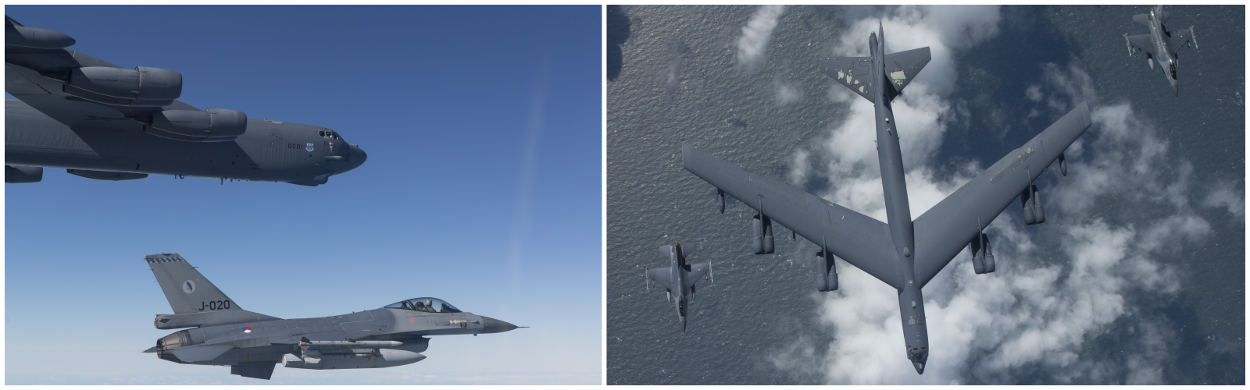 Terwijl we ons richting het noorden haasten, praten we met de gevechtsleider van het AOCS. Hij vertelt ons waar de bommenwerpers zich bevinden en houdt ons vrij van het overige luchtverkeer. Dit is geen gemakkelijke taak omdat we dwars door de aanvlieg en vertrek routes van Schiphol vliegen die precies over het midden van Nederland lopen. Een enorm druk gebied. Iedereen is super geconcentreerd bezig met zijn taak. We passeren Leeuwarden, waar onze collega’s per toerbeurt ook deze taak uitvoeren. Binnen 10 minuten ‘zien’ we de bommenwerpers op onze radar en nog ruim voordat ze Waddeneilanden bereiken hangen we naast ze. Deze keer zijn het twee Amerikaanse B-52 bommenwerpers die voor deze oefening helemaal vanuit de VS naar Nederland gevlogen zijn. Een missie van meer dan 24 uur. Een zeer geslaagde trainingsmissie voor iedereen. Iedere dag van ieder jaar, op die doordeweekse donderdag, maar ook tijdens Kerst en Oud & Nieuw houden militairen van de Koninklijke Luchtmacht de wacht en zorgen ervoor dat ons luchtruim veilig is en veilig blijft. In het belang van Nederland… Meer weten over F-16 vlieger Joost, kijk dan op magazines.defensie.nl/defensiekrant/2015/04/mijnmissieonsbelang-joost. Foto’s: Frank Crébas